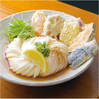 - 香川県産小麦粉を100%使用した、もちもち食感のうどん。瀬戸内産のいりこ、昆布、さば、めじか、うるめを使用した出汁もこだわり! オススメ:野菜天ぶっかけうどんなど
